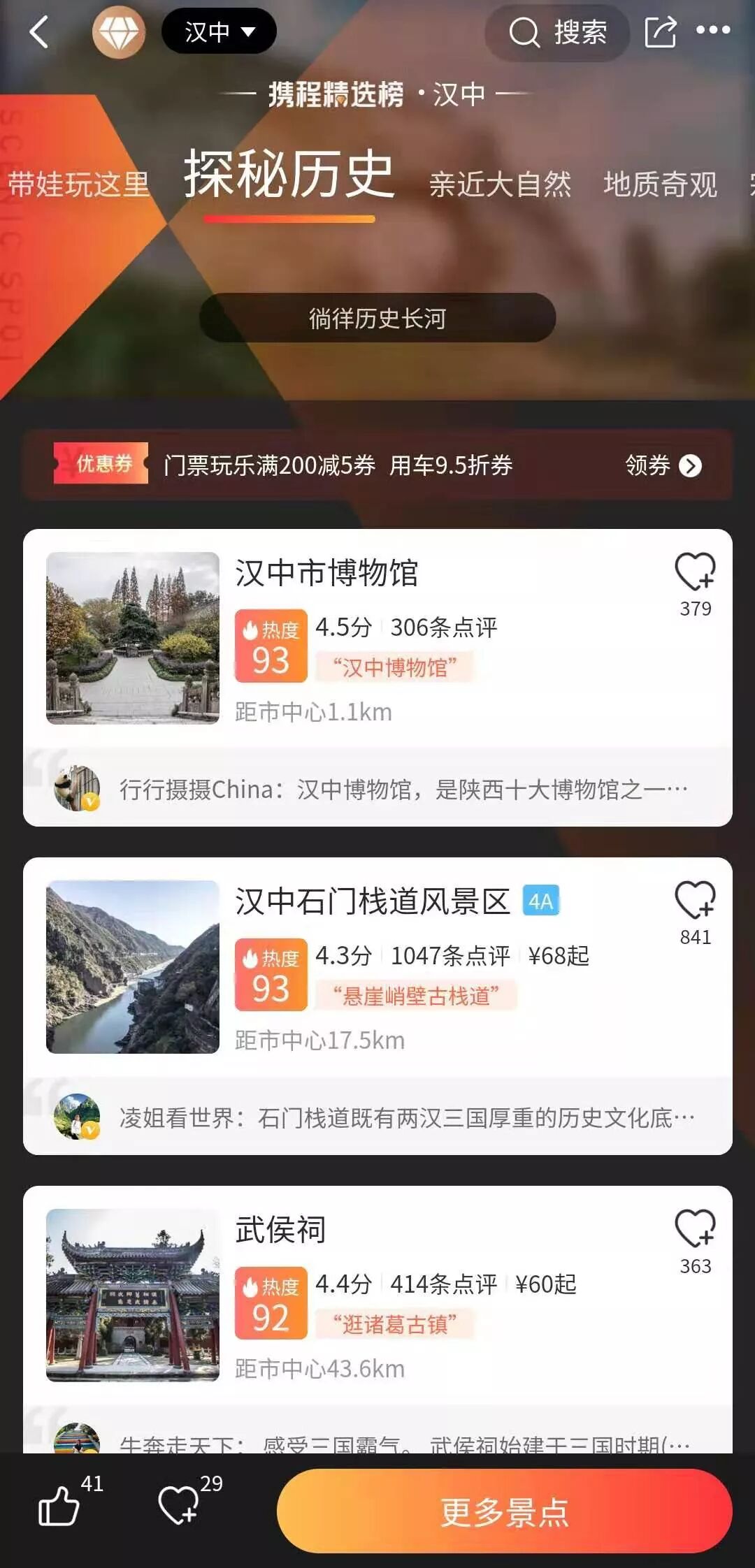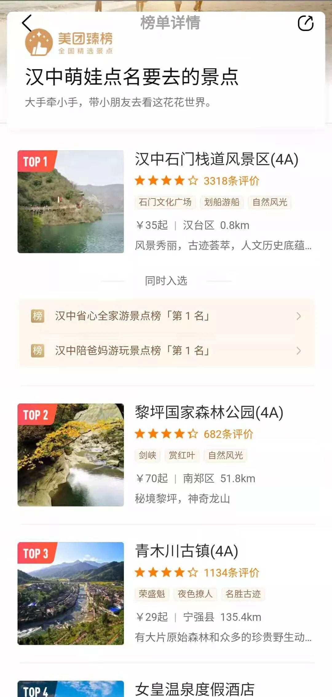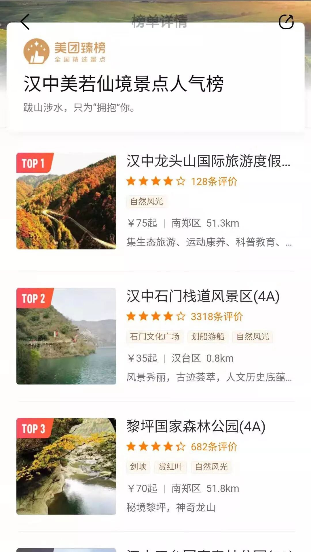 2019美团、携程两大网络平台相继推出汉中地区游客心目中最佳景点排行榜,游客朋友们,快来看看这里有没有你心目中的景点呢?这些景点你又去过几个。汉中作为一个有风景、有故事的城市,被誉为“汉家发祥地,中华聚宝盆”的中国历史文化名城,这里有太多的故事值得大家探寻、发现。