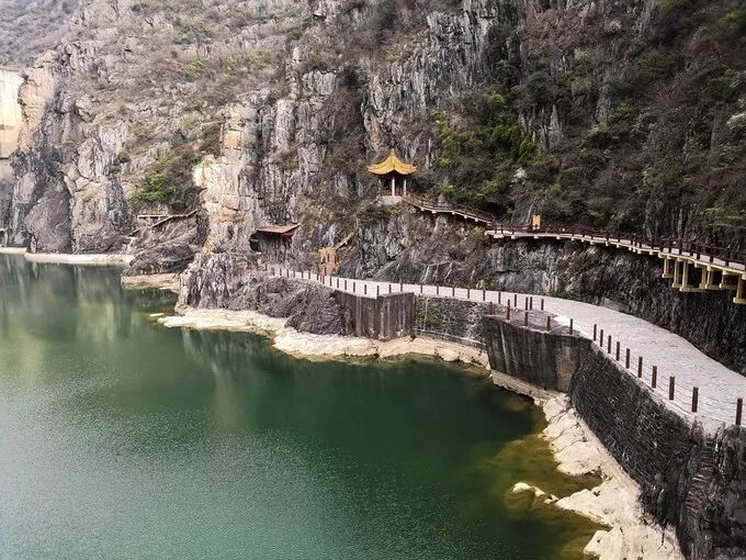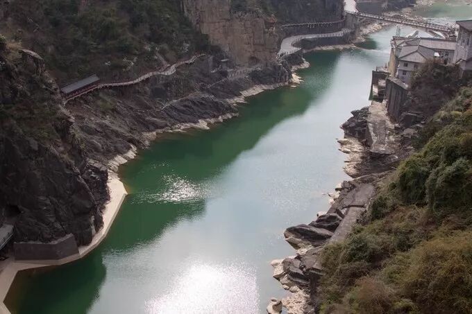 建在石门水库大坝西侧悬崖峭壁之间的新栈道,依然险峻。